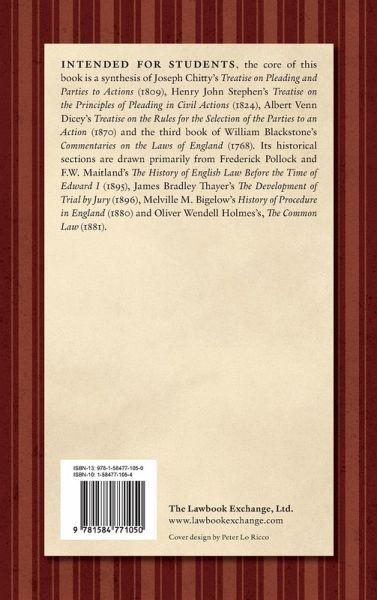 Intended for students, the core of this book is a synthesis of Joseph Chitty's Treatise on Pleading and Parties to Actions (1809), Henry John Stephen's Treatise on the Principles of Pleading in Civil Actions (1824), Albert Venn Dicey's Treatise on the Rules for the Selection of the Parties to an Action (1870) and the third book of William Blackstone's Commentaries on the Laws of England (1768). Its historical sections are drawn primarily from Frederick Pollock and F.W. Maitland's The History of English Law Before the Time of Edward I (1895), James Bradley Thayer's The Development of Trial by Jury (1896), Melville M. Bigelow's History of Procedure in England (1880) and Oliver Wendell Holmes's, The Common Law (1881). xxvi, 494 pp.
