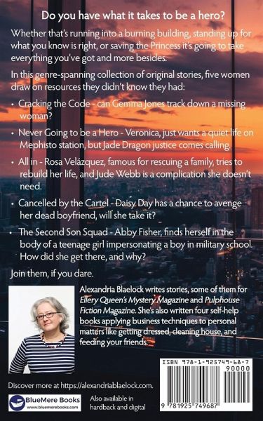 Do you have what it takes to be a hero? Whether that's running into a burning building, standing up for what you know is right, or saving the Princess it's going to take everything you've got and more besides. In this genre-spanning collection of original stories, five women draw on resources they didn't know they had:Cracking the Code - can Gemma Jones track down a missing woman? Never Going to be a Hero - Veronica, just wants a quiet life on Mephisto station, but Jade Dragon justice comes calling. All in - Rosa Velázquez, famous for rescuing a family, tries to rebuild her life, and Jude Webb is a complication she doesn't need. Cancelled by the Cartel - Daisy Day has a chance to revenge her dead boyfriend, will she take it? The Second Son Squad - Abby Fisher, finds herself in the body of a teenage girl impersonating a boy in military school. How did she get there, and why? Join them, if you dare.