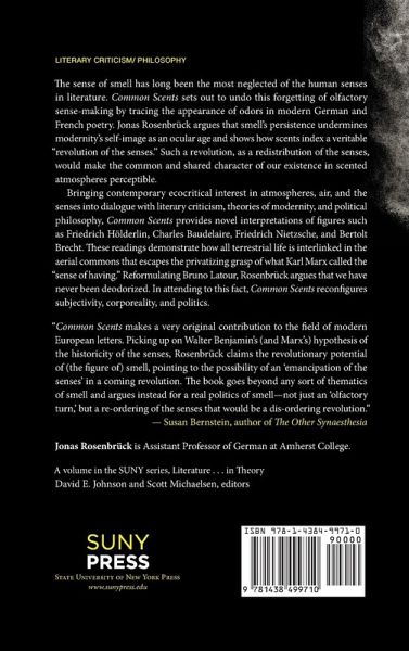The sense of smell has long been the most neglected of the human senses in literature. Common Scents sets out to undo this forgetting of olfactory sense-making by tracing the appearance of odors in modern German and French poetry. Jonas Rosenbrück argues that smell's persistence undermines modernity's self-image as an ocular age and shows how scents index a veritable "revolution of the senses." Such a revolution, as a redistribution of the senses, would make the common and shared character of our existence in scented atmospheres perceptible. Bringing contemporary ecocritical interest in atmospheres, air, and the senses into dialogue with literary criticism, theories of modernity, and political philosophy, Common Scents provides novel interpretations of figures such as Friedrich Hölderlin, Charles Baudelaire, Friedrich Nietzsche, and Bertolt Brecht. These readings demonstrate how all terrestrial life is interlinked in the aerial commons that escapes the privatizing grasp of what Karl Marx called the "sense of having." Reformulating Bruno Latour, Rosenbrück argues that we have never been deodorized. In attending to this fact, Common Scents reconfigures subjectivity, corporeality, and politics.