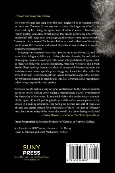 Attends to the much-neglected sense of smell in and around modern poetry to suggest the possibility of a revolution of the senses. The sense of smell has long been the most neglected of the human senses in literature. Common Scents sets out to undo this forgetting of olfactory sense-making by tracing the appearance of odors in modern German and French poetry. Jonas Rosenbrück argues that smell's persistence undermines modernity's self-image as an ocular age and shows how scents index a veritable "revolution of the senses." Such a revolution, as a redistribution of the senses, would make the common and shared character of our existence in scented atmospheres perceptible. Bringing contemporary ecocritical interest in atmospheres, air, and the senses into dialogue with literary criticism, theories of modernity, and political philosophy, Common Scents provides novel interpretations of figures such as Friedrich Hölderlin, Charles Baudelaire, Friedrich Nietzsche, and Bertolt Brecht. These readings demonstrate how all terrestrial life is interlinked in the aerial commons that escapes the privatizing grasp of what Karl Marx called the "sense of having." Reformulating Bruno Latour, Rosenbrück argues that we have never been deodorized. In attending to this fact, Common Scents reconfigures subjectivity, corporeality, and politics.