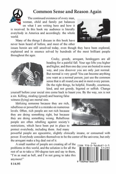 The continued existence of every man, woman, child and family pet balances on what I am writing here and how it is received. In this book my audience is literally everybody in America and accordingly. the whole world. Many of the things I discuss in this book have never been heard of before, and most of the other issues herein are still unsolved today, even though they have been explored, explained and in essence solved by hundreds of the most brilliant people throughout the ages. Cocky, greedy, arrogant, hotdoggers are all heading for a painful fall. Your ego lifts you higher and higher, and then one day your are bested in some way, and you discover you are only just normal. But normal is very good! You can become anything you want as a normal person; just use the common sense that is all round you and in most every person. Do the right things, be helpful, friendly, courteous, kind, and not greedy, bigoted or selfish. Change yourself before your social sins come back to haunt you. By the way, sex is not a sin. Killing, stealing (greed) and bearing false witness (lying) are mortal sins. Idolizing someone because they are rich, rebellious or powerful is a mistake on numerous levels. Often, rich people are not rich because they are doing something right, but because they are doing something wrong. Rebellious people are often rebelling against society's restrictions, which have been put in place to protect everybody, including them. And many powerful people are egocentric, slightly clinically insane, or consumed with power. Everybody considers themselves to be the center of the universe, but only the arrogant make a big deal out of it. A small number of people are creating all of the problems in this world, and the solution is for all the rest of us to take a 180-degree turn and say to them, "I'm as mad as hell, and I'm not going to take this anymore!"