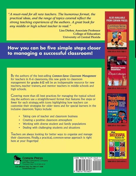 `There are quite a few gems hidden within this text, though. Focusing pupils through the non-verbal communication of positioning, eye contact, gestures and postures is certainly an innovative approach. Having positive expectations and expressing them appropriately is another excellent and workable idea. To have clear outcomes for your class so as to manage better is also an obvious but excellent tip. In general the positive, upbeat approach of the authors is highly commendable as something which works, not only in primary but also in secondary schools'- Nurturing Potential How you can be five simple steps closer to managing a successful classroom! By the authors of the best-selling Common-Sense Classroom Management for teachers in K-6 Classrooms, this new guide to classroom management for secondary schools will be an indispensable resource for new teachers, teacher trainers, and mentor teachers in middle schools and high schools. Covering more than 65 best practices for managing the typical school day, the authors use a straightforward format that features five steps or fewer for each strategy, with icons highlighting how teachers can customize their strategies for older teens and for special learners in the inclusive classroom, including: } taking care of teacher and classroom business } creating a positive classroom atmosphere } working with diverse student and family populations } dealing with challenging students and situations Teachers are always looking for better ways to organize and manage their classrooms. Finally, a practical, common-sense approach is right here at your fingertips!