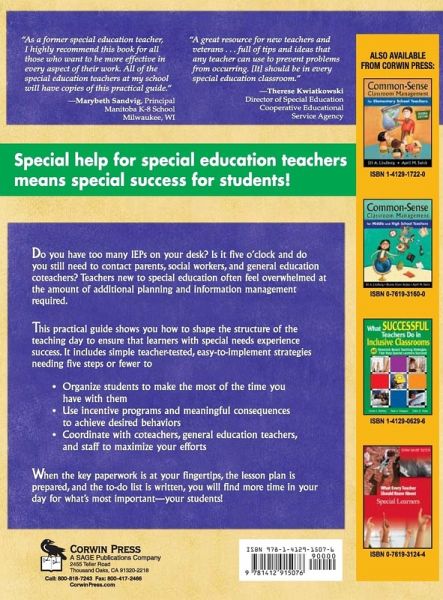 Foreword by Patricia A. Yahle Preface Acknowledgments About the Authors 1. Getting Organized Student Information Supplies and Materials Your Desk and Surrounding Area Forms and Schedules Room Arrangement 2. Organizing Students Adequate Storage Teaching Time Savers Student Desk Organization Mailboxes Routines and Rules Classroom Buddies 3. Classroom and Behavior Management Whole-Class Management Considerations for Students with Special Education Needs Managing Small Groups Developing Appropriate and Easily Implemented Behavior Programs Developing and Monitoring Behavior Intervention Plans Incentive Programs Negative Consequences When You Must Discipline... 4. Special Education Instructional Planning The IEP and Planning Grouping Students Finding Appropriate Materials Independent Work The IEP and Assistive Technology Using Assistive Technology as a Learning Support 5. General Education Instructional Planning Coordinating Efforts with the General Education Teacher and Support Staff Planning for Academic and Behavioral Success Co-Teaching and Co-Planning Adapting Lessons Accessing the General Education Curriculum Transition Times Special Education Instructional Planning Your Involvement in the General Education Classroom 6. Record Keeping and Information Management Creating a System Finding Time to Complete Paperwork IEP