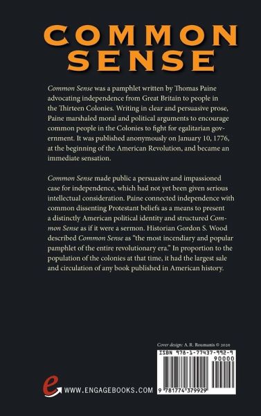 Common Sense was a pamphlet written by Thomas Paine advocating independence from Great Britain to people in the Thirteen Colonies. Writing in clear and persuasive prose, Paine marshaled moral and political arguments to encourage common people in the Colonies to fight for egalitarian government. It was published anonymously on January 10, 1776, at the beginning of the American Revolution, and became an immediate sensation. Common Sense made public a persuasive and impassioned case for independence, which had not yet been given serious intellectual consideration. Paine connected independence with common dissenting Protestant beliefs as a means to present a distinctly American political identity and structured Common Sense as if it were a sermon. Historian Gordon S. Wood described Common Sense as "the most incendiary and popular pamphlet of the entire revolutionary era." In proportion to the population of the colonies at that time, it had the largest sale and circulation of any book published in American history.