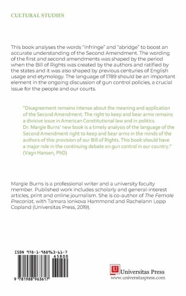This book analyses the words "infringe" and "abridge" to boost an accurate understanding of the Second Amendment. The wording of the first and second amendments was shaped by the period when the Bill of Rights was created by the authors and ratified by the states and it was shaped by previous centuries of English usage and etymology. The language of 1789 should be an important element in the ongoing discussion of gun control policies, a crucial issue for the people and our courts. "Disagreement remains intense about the meaning and application of the Second Amendment. The right to keep and bear arms remains a divisive issue in American Constitutional law and in politics. Dr. Margie Burns' new book is a timely analysis of the language of the Second Amendment right to keep and bear arms in the minds of the authors of this provision of our Bill of Rights. This book should have a major role in the continuing debate on gun control in our country." (Vagn Hansen, PhD) Margie Burns is a professional writer and a university faculty member. Published work includes scholarly and general-interest articles, print and online journalism, and The Female Precariat, with Tamara Ionkova Hammond and Rachelann Lopp Copland (Universitas Press, 2019).
