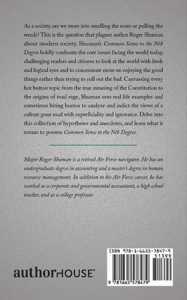 As a society, are we more into smelling the roses or pulling the weeds? This is the question that plagues author Roger Shuman about modern society. Shuman's Common Sense to the Nth Degree boldly confronts the core issues facing the world today, challenging readers and citizens to look at the world with fresh and logical eyes and to concentrate more on enjoying the good things rather than trying to cull out the bad. Canvassing every hot button topic from the true meaning of the Constitution to the origins of road rage, Shuman uses real life examples and sometimes biting humor to analyze and indict the views of a culture gone mad with superficiality and ignorance. Delve into this collection of hypotheses and anecdotes, and learn what it means to possess Common Sense to the Nth Degree.