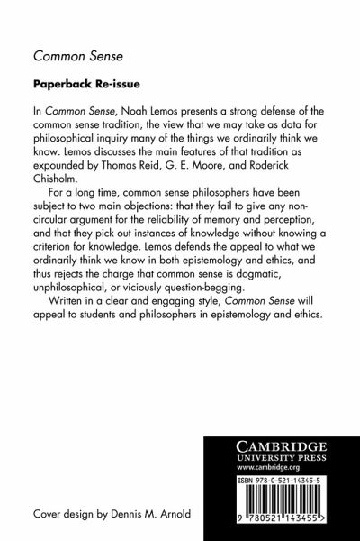 In this 2004 book, Noah Lemos presents a strong defense of the common sense tradition, the view that we may take as data for philosophical inquiry many of the things we ordinarily think we know. He discusses the main features of that tradition as expounded by Thomas Reid, G. E. Moore and Roderick Chisholm. For a long time common sense philosophers have been subject to two main objections: that they fail to give any non-circular argument for the reliability of memory and perception; and that they pick out instances of knowledge without knowing a criterion for knowledge. Lemos defends the appeal to what we ordinarily think we know in both epistemology and ethics and thus rejects the charge that common sense is dogmatic, unphilosophical or question-begging. Written in a clear and engaging style, this book will appeal to students and philosophers in epistemology and ethics.