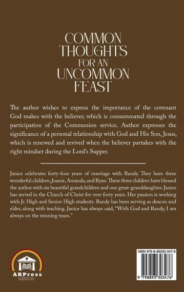 Janice celebrates forty-four years of marriage with Randy. They have three wonderful children, Joanie, Amanda, and Ryan. These three children have blessed the author with six beautiful grandchildren and one great-granddaughter. Janice has served in the Church of Christ for over forty years. Her passion is working with Jr. High and Senior High students. Randy has been serving as deacon and elder, along with teaching. Janice has always said, "With God and Randy, I am always on the winning team."