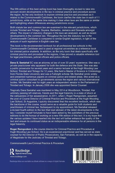 Dana S. Seetahal SC was an attorney at law of over 30 years' experience. She was a private practitioner who appeared for both the defence and the State. She was also a public prosecutor for several years and a senior lecturer at the Hugh Wooding Law School, Trinidad and Tobago for 12 years. She held a Master of Science in Criminology from Florida State University and was a Fulbright scholar. Ms Seetahal wrote widely and presented numerous papers on criminal justice and related areas. She acted as a criminal justice consultant to governments across the region and various international bodies. Ms Seetahal was for eight years an independent senator in the Parliament of Trinidad and Tobago. In January 2006 she was appointed Senior Counsel. Tragically Dana Seetahal was murdered in May 2014 at Woodbrook, Trinidad. Her untimely passing left relatives, friends and the legal fraternity in a state of shock at the callousness of her assassination. In 2011, when I, Roger Ramgoolam, assumed the post of Course Director of Criminal Practice and Procedure at the Hugh Wooding Law School, St Augustine, I quickly discovered that this excellent textbook, which was the backbone of the course, would serve as a valuable guide for both students and practitioners of criminal law. Subsequent to my appointment, Ms Seetahal released a revised fourth edition to the text that kept abreast of the latest developments in the law. I consider myself fortunate to have been asked by the publishers of the previous editions to do the honour of working on a new fifth edition of this text. It is my hope that the various updates I have inserted into the text will further enhance the quality of the text and ensure its continued status as an indispensable reference for all persons in the legal fraternity. Roger Ramgoolam is the course director for Criminal Practice and Procedure at Hugh Wooding Law School. He is an experienced practitioner and has served as state counsel for the Director of Public Prosecutions, San Fernando, as well as in the capacity of Magistrate for the Judiciary of Trinidad and Tobago.