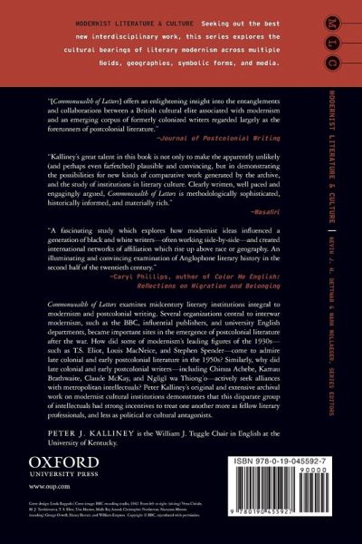 Commonwealth of Letters examines midcentury literary institutions integral to modernism and postcolonial writing. Several organizations central to interwar modernism, such as the BBC, influential publishers, and university English departments, became important sites in the emergence of postcolonial literature after the war. How did some of modernism's leading figures of the 1930s--such as T.S. Eliot, Louis MacNeice, and Stephen Spender--come to admire late colonial and early postcolonial literature in the 1950s? Similarly, why did late colonial and early postcolonial writers--including Chinua Achebe, Kamau Brathwaite, Claude McKay, and Ngugi wa Thiong'o--actively seek alliances with metropolitan intellectuals? Peter Kalliney's original and extensive archival work on modernist cultural institutions demonstrates that this disparate group of intellectuals had strong professional incentives to treat one another more as fellow literary professionals, and less as political or cultural antagonists.