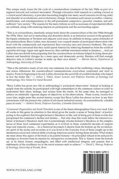 «This is an extraordinary, absolutely unique book about the counterculture of the late 1960s through the 1970s. Here, laid out in meticulous and abundant detail, is an historical account of the genesis of the hippie communes of Vermont and adjacent rural areas. In addition to being a great chronicler of the counterculture, Barry Laffan, now deceased, was a superb master of participant observation who lived with the communards and experienced their everyday joys and sorrows firsthand. The communards were convinced that they could upend America by removing themselves from the world of capitalist strivings. Again and again however, their sublime intentions ended in disasters... And yet Laffan does not shrink from proposing that the counterculture on balance helped to bring about permanent and beneficial changes for a more open and democratic society. Readers will find enough objective data in Laffan's treatise to make up their own minds.» (Marvin Harris, Department of Anthropology, University of Florida)