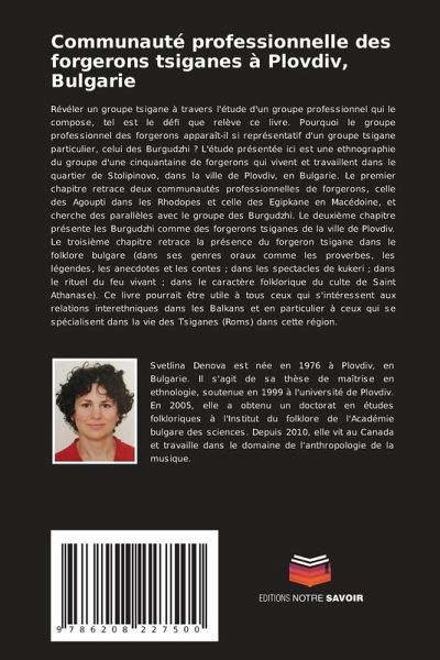 Révéler un groupe tsigane à travers l'étude d'un groupe professionnel qui le compose, tel est le défi que relève ce livre. Pourquoi le groupe professionnel des forgerons apparaît-il si représentatif d'un groupe tsigane particulier, celui des Burgudzhi ? L'étude présentée ici est une ethnographie du groupe d'une cinquantaine de forgerons qui vivent et travaillent dans le quartier de Stolipinovo, dans la ville de Plovdiv, en Bulgarie. Le premier chapitre retrace deux communautés professionnelles de forgerons, celle des Agoupti dans les Rhodopes et celle des Egipkane en Macédoine, et cherche des parallèles avec le groupe des Burgudzhi. Le deuxième chapitre présente les Burgudzhi comme des forgerons tsiganes de la ville de Plovdiv. Le troisième chapitre retrace la présence du forgeron tsigane dans le folklore bulgare (dans ses genres oraux comme les proverbes, les légendes, les anecdotes et les contes ; dans les spectacles de kukeri ; dans le rituel du feu vivant ; dans le caractère folklorique du culte de Saint Athanase). Ce livre pourrait être utile à tous ceux qui s'intéressent aux relations interethniques dans les Balkans et en particulier à ceux qui se spécialisent dans la vie des Tsiganes (Roms) dans cette région.