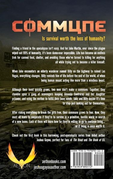 Is survival worth the loss of humanity? Finding a friend in the apocalypse isn't easy. And for Jake Martin, ever since the plague wiped out 99% of humanity, it's been damn-near impossible. Life has become an endless trek for canned food, shelter, and avoiding those who've turned to killing for anything all while trying not to become a killer himself. When Jake encounters an elderly wanderer named Billy on the highway to ruined Las Vegas, everything changes. Billy reminds him of life before the end of the world, of when being human meant acting like more than a mindless beast. Although their bond quickly grows, two men don't make a commune. Together, they stumble upon a gang of scavengers keeping Amanda Contreras and her daughter prisoner, and using the mother to fulfill their base needs. Jake and Billy decide it’s time to stop just looking out for themselves. After risking everything to break the girls free, their commune grows to four. Now, they must all learn to cooperate if they're to survive in a primitive, hostile world in search of a new home. Each of them will learn how far they're willing to go to continue living... or if living is even worth it. Check out the first book in this harrowing, post-apocalyptic series from debut author Joshua Gayou, perfect for fans of The Road and The Book of Eli. You can also pick it up on Audible performed by the award-winning RC Bray.