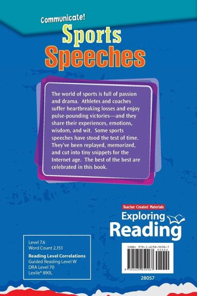 In the world of sports, players and coaches experience heartbreaking losses and pulse-pounding victories. They share their emotions, insights, wisdom, and wit through speeches. Some of these sports speeches have stood the test of time. They've been replayed, memorized, and cut into tiny snippets for the internet. These inspirational stories and speeches are celebrated in this full-color book that is packed with fun facts, fascinating sidebars, and high-interest content. Featuring TIME© content and images, this informational text has features such as a glossary, an index, and a table of contents to engage students in reading as they build their comprehension, vocabulary, and reading skills. The Reader's Guide and extended Try It! activity increase understanding of the material, and develop higher-order thinking. Check It Out! offers print and online resources for additional reading. Keep students reading from cover to cover with this captivating text!