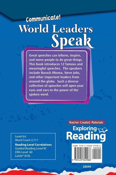 Orators take ordinary words and weave them into brilliant speeches. It takes a substantial amount of skill to be a great orator. History is full of leaders who have given inspiring speeches. Learn about twelve famous speeches from leaders such as Cesar Chavez, Ronald Reagan, Pat Summitt, Justin Trudeau, and Martin Luther King Jr. This diverse collection of speeches will open your eyes and ears to the power of the spoken word! Packed with fun facts, fascinating sidebars, and featuring TIME© content and images, this informational text has features such as a glossary, an index, and a table of contents to engage students in reading as they build their comprehension, vocabulary, and reading skills. The Reader's Guide and extended Try It! activity increase understanding of the material, and develop higher-order thinking. Check It Out! offers print and online resources for additional reading. Keep students reading from cover to cover with this captivating text!