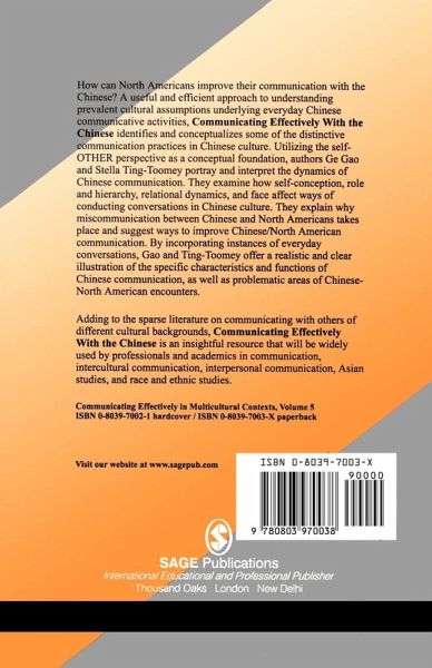 Utilizing the `self-OTHER' perspective as a conceptual foundation, the authors portray and interpret some of the distinctive communication practices in Chinese culture. They examine how self-conception, role and hierarchy, relational dynamics and face affect ways of conducting everyday talk in Chinese culture. They explain why miscommunication between Chinese and North Americans takes place and suggest ways to improve communication. By incorporating instances of everyday talk, the authors offer a realistic and clear illustration of the specific characteristics and functions of Chinese communication, as well as problematic areas of Chinese/North American encounters.