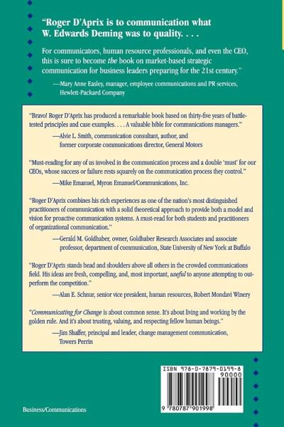 Marshal support throughout your organization Develop a communications strategy that works for -- not against -- you. Based on years of battle-tested principles and case-examples, Roger D'Aprix tells managers how they can avoid the communications breakdowns that sabotage attempts at change, and cause employees to lose faith in their leaders and the system itself. Instead, he shows how communications can be used strategically to connect an organization's vision, mission and business goals to the forces and opportunities in the marketplace -- the driving force behind all change. Includes D'Arpix's market-based strategic communications model for integrating and aligning communications at all levels.