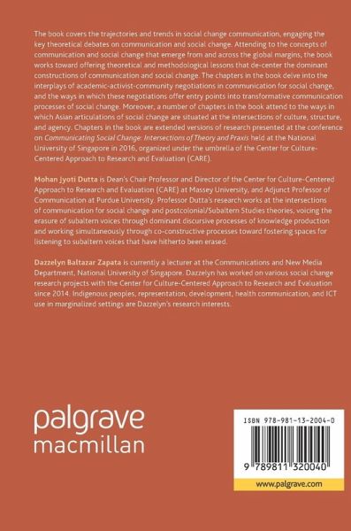 The book covers the trajectories and trends in social change communication, engaging the key theoretical debates on communication and social change. Attending to the concepts of communication and social change that emerge from and across the global margins, the book works toward offering theoretical and methodological lessons that de-center the dominant constructions of communication and social change. The chapters in the book delve into the interplays of academic-activist-community negotiations in communication for social change, and the ways in which these negotiations offer entry points into transformative communication processes of social change. Moreover, a number of chapters in the book attend to the ways in which Asian articulations of social change are situated at the intersections of culture, structure, and agency. Chapters in the book are extended versions of research presented at the conference on Communicating Social Change: Intersections of Theory and Praxis held atthe National University of Singapore in 2016, organized under the umbrella of the Center for Culture-Centered Approach to Research and Evaluation (CARE).