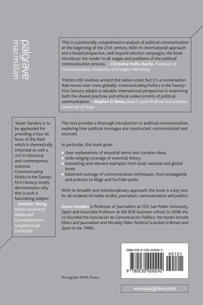 From propaganda to protests, this book provides an in depth study of politics and the media today. Using historical and contemporary examples, Sanders covers the essential theory and key research in the field. Topical and comprehensive, this book covers everything students need to know about the global world of political communication.