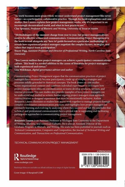 Communicating Project Management argues that the communication practices of project managers have necessarily become participatory, made up of complex strategies and processes solidly grounded in rhetorical concepts. The book draws on case studies across organizational contexts and combines individual experiences to investigate how project management relies on communication as teams develop products, services, and internal processes. The case studies also provide examples of how project managers can be understood and studied as writers, further arguing project managers must approach communication as designed experience that must be intentionally inclusive. Author Benjamin Lauren illustrates to readers how teams work together to manage projects through complex coordinative communication practices, and highlights how project managers are constantly learning and evolving by analyzing where they succeed and fail. He concludes that technical and professional communicators have a pivotal role in supporting and facilitating participative approaches to communicating project management.