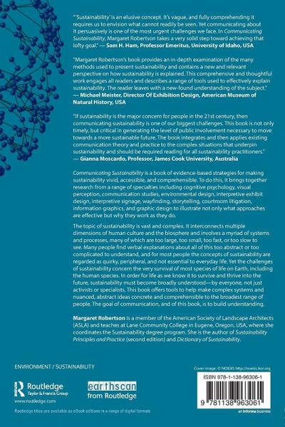 Communicating Sustainability is a book of evidence-based strategies for making sustainability vivid, accessible, and comprehensible. To do this, it brings together research from a range of specialties including cognitive psychology, visual perception, communication studies, environmental design, interpretive exhibit design, interpretive signage, wayfinding, storytelling, courtroom litigation, information graphics, and graphic design to illustrate not only what approaches are effective but why they work as they do.