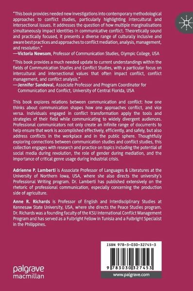 This book explores relations between communication and conflict. How one thinks about communication is demonstrated as shaping how one approaches conflict, and vice versa. Individuals engaged in conflict transformation apply the tools and strategies of their field while communicating to widely divergent audiences. Professional communicators not only create an infinite range of documents to help ensure that work is accomplished effectively, efficiently, and safely, but also address conflicts in the workplace and in the public sphere. Thoughtfully exploring connections between communication studies and conflict studies, this collection engages with research and practice on topics including the potential of social media during revolution, the role of gender during mediation, and the importance of critical genre usage during industrial crisis.