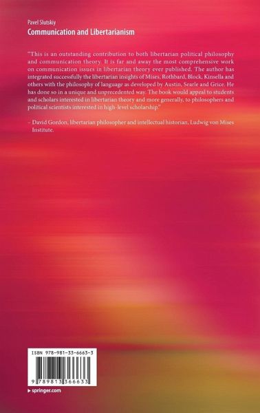 "This is an outstanding contribution to both libertarian political philosophy and communication theory. It is far and away the most comprehensive work on communication issues in libertarian theory ever published. The author has integrated successfully the libertarian insights of Mises, Rothbard, Block, Kinsella and others with the philosophy of language as developed by Austin, Searle and Grice. He has done so in a unique and unprecedented way. The book would appeal to students and scholars interested in libertarian theory and more generally, to philosophers and political scientists interested in high-level scholarship." - David Gordon, libertarian philosopher and intellectual historian, Ludwig von Mises Institute.