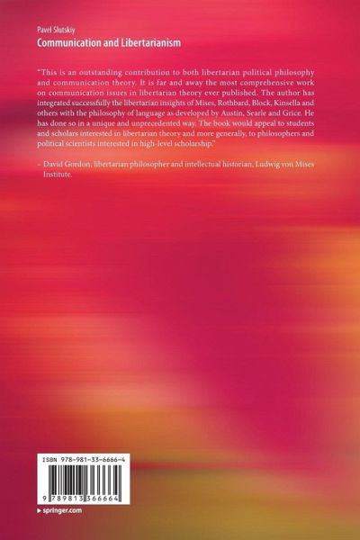 "This is an outstanding contribution to both libertarian political philosophy and communication theory. It is far and away the most comprehensive work on communication issues in libertarian theory ever published. The author has integrated successfully the libertarian insights of Mises, Rothbard, Block, Kinsella and others with the philosophy of language as developed by Austin, Searle and Grice. He has done so in a unique and unprecedented way. The book would appeal to students and scholars interested in libertarian theory and more generally, to philosophers and political scientists interested in high-level scholarship." - David Gordon, libertarian philosopher and intellectual historian, Ludwig von Mises Institute.