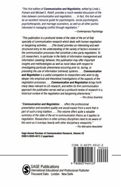 Consolidating alternative perspectives on communication and negotiation, this volume reviews the work of noted communication scholars and suggests directions for future research. Contributors explore three major aspects of negotiation communication: strategies, tactics and negotiation processes; interpretive processes and language analysis; and negotiation situation and context. This research also explores bargaining planning, framing and reframing, as well as relational communication with opponents, constituents and audiences.