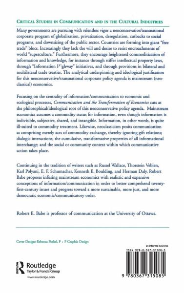 Introduction Part One: Information and Communication in Mainstream Economics Information Industries and Economic Analysis: Policy Makers Beware Commodities as Signs The Place of Information in Economics Part Two: Interrelations Between Economics and Communication Studies Communication: Blindspot of Western Economics On Political Economy Information, Economics, and Ecosystem Part Three: Information and Communication in Institutional and Evolutionary Economics T. R. Malthus and the Origins of Communication in Economics The Communication Theory of Thorstein Veblen The Communication Theory of Kenneth E. Boulding Part Four: Policy Applications Emergence and Development of Canadian Communications: Dispelling the Myths Telecommunications Policy: Real World of the Canadian Information Highway "Life is Information": Canadian Communication and the Legacy of Graham Spry Conclusion