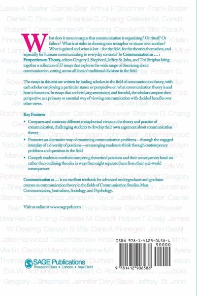 Communication As... is a collection of 27 essays by leading thinkers in the field of communication theory. Each author in the volume has chosen a particular stance on communication and forwarded it as a primary or essential way of viewing communication with decided benefits over other views. The chapters in the book are brief, argumentative, and forceful; together they explore the wide range of theorizing about communication, cutting across all lines of traditional divisions in the field.