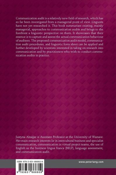 Communication audit is a relatively new field of research, which has so far been investigated from a managerial point of view. Linguists have not yet researched it. This book summarises existing, mainly managerial, approaches to communication audits and brings to the forefront a linguistic perspective on them. It showcases that their essence is to capture and assess the actual communication behaviour of auditees. The proposed communication audit model, communication audit procedures, and linguistic form sheet can be applied and further developed by scientists interested in taking on research into communication and by practitioners who wish to conduct communication audits in practice.