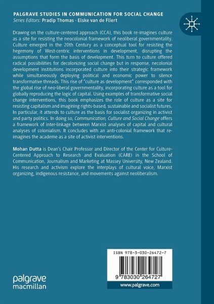 Drawing on the culture-centered approach (CCA), this book re-imagines culture as a site for resisting the neocolonial framework of neoliberal governmentality. Culture emerged in the 20th Century as a conceptual tool for resisting the hegemony of West-centric interventions in development, disrupting the assumptions that form the basis of development. This turn to culture offered radical possibilities for decolonizing social change but in response, necolonial development institutions incorporated culture into their strategic framework while simultaneously deploying political and economic power to silence transformative threads. This rise of "culture as development" corresponded with the global rise of neo-liberal governmentality, incorporating culture as a tool for globally reproducing the logic of capital. Using examples of transformative social change interventions, this book emphasizes the role of culture as a site for resisting capitalism and imagining rights-based,sustainable and socialist futures. In particular, it attends to culture as the basis for socialist organizing in activist and party politics. In doing so, Culture, Participation and Social Change offers a framework of inter-linkage between Marxist analyses of capital and cultural analyses of colonialism. It concludes with an anti-colonial framework that re-imagines the academe as a site of activist interventions.