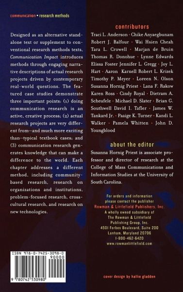 Designed as an alternative stand-alone text or supplement to conventional research methods texts, Communication Impact introduces methods through engaging narrative descriptions of actual research projects driven by contemporary real-world questions. Each chapter addresses a different method, including community-based research, research on organizations and institutions, problem-focused research, cross-cultural research, and research on new technologies.