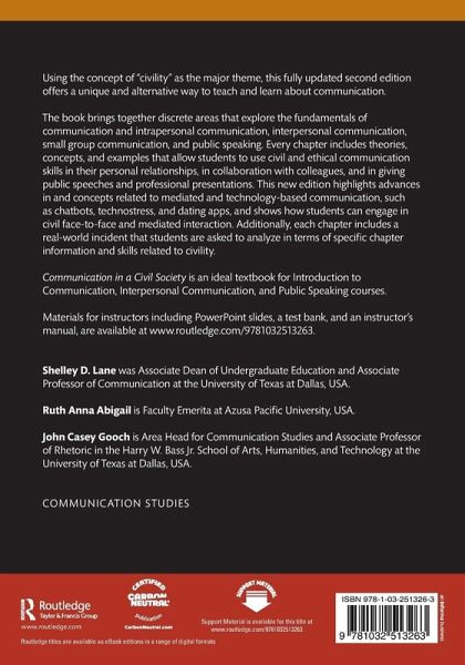 The book brings together discrete areas that explore the fundamentals of communication and intrapersonal communication, interpersonal communication, small group communication, and public speaking. Every chapter includes theories, concepts, and examples that allow students to use civil and ethical communication skills in their personal relationships, in collaboration with colleagues, and in giving public speeches and professional presentations. This new edition highlights advances in and concepts related to mediated and technology-based communication, such as chatbots, technostress, and dating apps, and shows how students can engage in civil face-to-face and mediated interaction. Additionally, each chapter includes a real-world incident that students are asked to analyze in terms of specific chapter informationand skills related to civility.