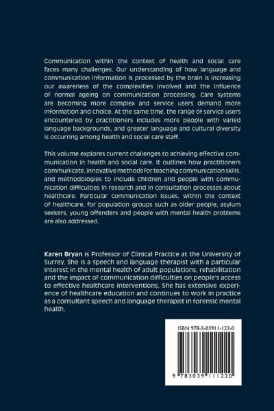 This volume explores current challenges to achieving effective communication in health and social care. It outlines how practitioners communicate, innovative methods for teaching communication skills, and methodologies to include children and people with communication difficulties in research and in consultation processes about healthcare. Particular communication issues, within the context of healthcare, for population groups such as older people, asylum seekers, young offenders and people with mental health problems are also addressed.