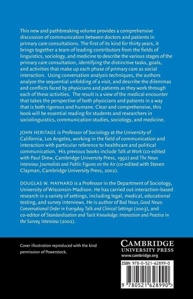 1. Introduction: analyzing interaction between doctors and patients in primary care encounters John Heritage and Douglas W. Maynard; 2. Soliciting patients' presenting concerns Jeffrey Robinson; 3. Accounting for the visit: giving reasons for seeking medical care John Heritage and Jeffrey Robinson; 4. Realizing the illness: patients' narratives of symptom discovery Tim Halkowski; 5. Explaining illness: patients' proposals and physicians' responses Virginia Gill and Douglas W. Maynard; 6. Taking the history: questioning during comprehensive history taking Elizabeth Boyd and John Heritage; 7. Body work: the collaborative production of the clinical object Christian Heath; 8. Communicating and responding to diagnosis Anssi Peräkylä; 9. On diagnostic rationality: bad news, good news, and the symptom residue Douglas W. Maynard and Richard M. Frankel; 10. Treatment decisions: negotiations between doctors and patients in acute care encounters Tanya Stivers; 11. Prescriptions and prescribing: co-ordinating talk and text-based activities David Greatbach; 12. Lifestyle discussions in medical interviews Marja-Leena Sorjonen, Liisa Raevaara, Markku Haakana, Tuukka Tammi and Anssi Peräkylä; 13. Co-ordinating closings in medical interviews: producing continuity of care Candace West; 14. Mis-alignments in 'after-hours' calls to a British GP's practice: a study in telephone medicine Paul Drew.