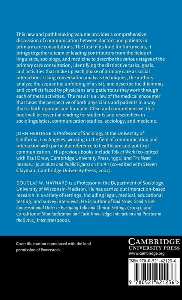This 2006 volume provides a comprehensive discussion of communication between doctors and patients in primary care consultations. It brings together a team of leading contributors from the fields of linguistics, sociology and medicine to describe each phase of the primary care consultation, identifying the distinctive tasks, goals and activities that make up each phase of primary care as social interaction. Using conversation analysis techniques, the authors analyze the sequential unfolding of a visit, and describe the dilemmas and conflicts faced by physicians and patients as they work through each of these activities. The result is a view of the medical encounter that takes the perspective of both physicians and patients in a way that is both rigorous and humane. Clear and comprehensive, this book will be essential reading for students and researchers in sociolinguistics, communication studies, sociology, and medicine.
