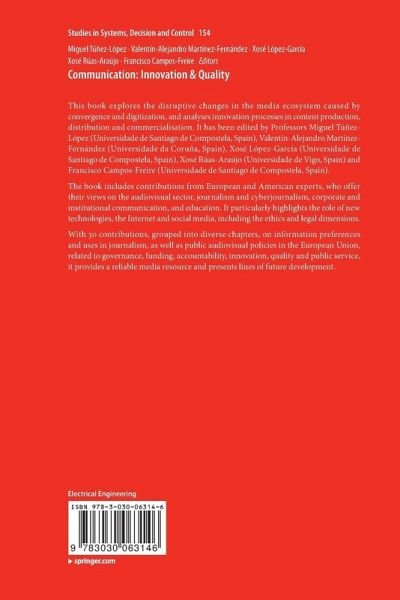 This book explores the disruptive changes in the media ecosystem caused by convergence and digitization, and analyses innovation processes in content production, distribution and commercialisation. It has been edited by Professors Miguel Túñez-López (Universidade de Santiago de Compostela, Spain), Valentín-Alejandro Martínez-Fernández (Universidade da Coruña, Spain), Xosé López-García (Universidade de Santiago de Compostela, Spain), Xosé Rúas-Araújo (Universidade de Vigo, Spain) and Francisco Campos-Freire (Universidade de Santiago de Compostela, Spain). The book includes contributions from European and American experts, who offer their views on the audiovisual sector, journalism and cyberjournalism, corporate and institutional communication, and education. It particularly highlights the role of new technologies, the Internet and social media, including the ethics and legal dimensions. With 30 contributions, grouped into diverse chapters, on information preferences and uses in journalism, as well as public audiovisual policies in the European Union, related to governance, funding, accountability, innovation, quality and public service, it provides a reliable media resource and presents lines of future development.