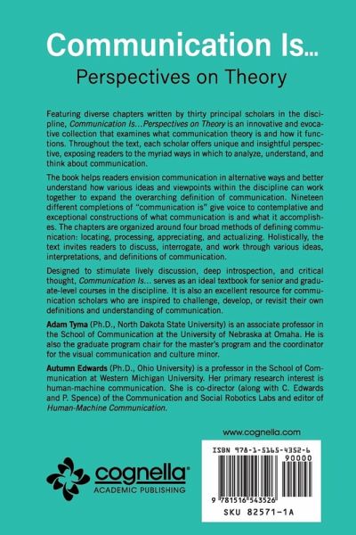 Featuring diverse chapters written by thirty principal scholars in the discipline, Communication Is…Perspectives on Theory is an innovative and evocative collection that examines what communication theory is and how it functions. Throughout the text, each scholar offers unique and insightful perspective, exposing readers to the myriad ways in which to analyze, understand, and think about communication. The book helps readers envision communication in alternative ways and better understand how various ideas and viewpoints within the discipline can work together to expand the overarching definition of communication. Nineteen different completions of "communication is" give voice to contemplative and exceptional constructions of what communication is and what it accomplishes. The chapters are organized around four broad methods of defining communication: locating, processing, appreciating, and actualizing. Holistically, the text invites readers to discuss, interrogate, and work through various ideas, interpretations, and definitions of communication. Designed to stimulate lively discussion, deep introspection, and critical thought, Communication Is… serves as an ideal textbook for senior and graduate-level courses in the discipline. It is also an excellent resource for communication scholars who are inspired to challenge, develop, or revisit their own definitions and understanding of communication. Adam Tyma (Ph.D., North Dakota State University) is an associate professor in the School of Communication at the University of Nebraska at Omaha. He is also the graduate program chair for the master’s program and the coordinator for the visual communication and culture minor. Autumn Edwards (Ph.D., Ohio University) is a professor in the School of Communication at Western Michigan University. Her primary research interest is human-machine communication. She is co-director (along with C. Edwards and P. Spence) of the Communication and Social Robotics Labs and editor of Human-Machine Communication.