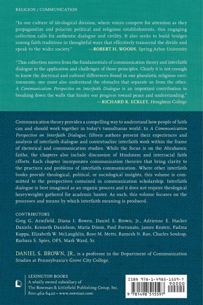 Part 1: Fundamentals Chapter 1: Communication Theory Meets Interfaith Dialogue Daniel S. Brown, Jr. Chapter 2: Managing the Anxiety and Uncertainty of Religious Otherness: Interfaith Dialogue as a Problem of Intercultural Communication Mark Ward, Sr. Chapter 3: Humanizing and Dehumanizing Responses Across Four Orientations to Religious Otherness Charles Soukup and James Keaten Chapter 4: Rhetorology and Interfaith Dialogue Adrienne E. Hacker Daniels Part 2: Applications Chapter 5: A Narrative Approach to Interfaith Dialogue: Explanations & Recommendations Kenneth Danielson Chapter 6: St. Francis and the Sultan: Adaptive Structuration Theory Barbara S. Spies, OFS Chapter 7: Hope Analysis: Pathways, Agency, and Interfaith Dialogue Daniel S. Brown, Jr. Chapter 8: The Power of Living Parables for Transformative Interfaith Encounters Elizabeth W. McLaughlin Chapter 9: Memory and Interfaith Dialogue in the Context of Globalization Diana I. Bowen and Paul Fortunato Chapter 10: Speech and Silence as Rhetorical Space: Lessons from an Inter-Racial Church Rose M. Metts Part 3: Challenges Chapter 11: Not in my Sandbox: Organizational Culture, Identity, and Interfaith Collaboration Maria Dixon and Greg G. Armfield Chapter 12: Hindu Interfaith Discourse: Spiral of Silence as a Theological Inevitability Ramesh N. Rao and Padma Kuppa Chapter 13: The "God Problem" In Interfaith Dialogue: Situating Divine Speech in the Seven Traditions of Communication Theory Mark Ward, Sr.