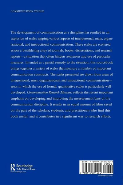 The development of communication as a discipline has resulted in an explosion of scales tapping various aspects of interpersonal, mass, organizational, and instructional communication. This sourcebook brings together scales that measure a variety of important communication constructs. The scales presented are drawn from areas of interpersonal, mass, organizational, and instructional communication--areas in which the use of formal, quantitative scales is particularly well developed. Communication Research Measures reflects the recent important emphasis on developing and improving the measurement base of the communication discipline. It results in an equal amount of labor saved on the part of the scholars, students, and practitioners who find this book useful, and it contributes in a significant way to research efforts. Originally published by Guilford Press in 1994, now available from Routledge.