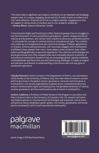 List of Figures List of Tables Notes on Contributors Foreword; Marjan de Bruin Acknowledgements List of Abbreviations Introduction: Communication Rights and Social Justice: Historical Accounts of Transnational Mobilizations; Claudia Padovani and Andrew Calabrese PART I: COMMUNICATION STRUGGLES IN A GLOBALIZING CONTEXT 1. Communication Rights and the History of Ideas; Cees Hamelink 2. Communication Rights and Media Justice between Political and Discursive Opportunities: A Historical Perspective; Stefania Milan and Claudia Padovani 3. Living the New International Information Order; Roberto Savio 4. Continuities and Change in the Nexus of Communication and Development; Ingela Svedin 5. Are States still Important? Reflections on the Nexus between National and Global Media and Communication Policy; Marc Raboy and Ayesha Mawani PART II: MOBILIZING COMMUNICATIONS: REGIONAL PERSPECTIVES AND PRACTICES 6. The Democratization of Communication: Latin American Perspectives and Initiatives; Sally Burch 7. Beyond the Dominant Paradigm of Communication Rights? Observations from South Asia; Pradip Thomas 8. Establishing a 'Rights Regime' in Iran: Thinking Communications, Politics and Gender Together; Annabelle Sreberny 9. Communication Rights as a Networking Reality: Community Radio in Europe; Salvatore Scifo 10. Media Reform and Communication Rights in the United States; Andrew Calabrese PART III: ONGOING RESISTANCE, NEW FRAMES AND CHANGING NARRATIVES 11. Media Justice and Communication Rights; Seeta Peña Gangadharan 12. Bringing Communication Back In: Social Movements and Media; Lorenzo Mosca 13. Reframing Communication Rights: Why Gender Matters; Margaret Gallagher 14. Practising Communication Rights: Cases from South Korea and Honduras; Dorothy Kidd 15. Communication Rights and Neoliberal Development: Techno-Politics in India; Paula Chakravartty 16. Remixing the Spring! Connective Leadership and Read-Write Practices in the 2011 Arab Uprisings; Donatella della Ratta and AugustoValeriani Afterword; Andrew Calabrese and Claudia Padovani Bibliography Index