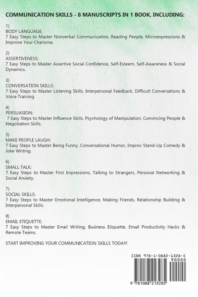 COMMUNICATION SKILLS - 8 MANUSCRIPTS IN 1 BOOK, INCLUDING: 1) BODY LANGUAGE: 7 Easy Steps to Master Nonverbal Communication, Reading People, Microexpressions & Improve Your Charisma. 2) ASSERTIVENESS: 7 Easy Steps to Master Assertive Social Confidence, Self-Esteem, Self-Awareness & Social Dynamics. 3) CONVERSATION SKILLS: 7 Easy Steps to Master Listening Skills, Interpersonal Feedback, Difficult Conversations & Voice Training. 4) PERSUASION: 7 Easy Steps to Master Influence Skills, Psychology of Manipulation, Convincing People & Negotiation Skills. 5) MAKE PEOPLE LAUGH: 7 Easy Steps to Master Being Funny, Conversational Humor, Improv Stand-Up Comedy & Joke Writing. 6) SMALL TALK: 7 Easy Steps to Master First Impressions, Talking to Strangers, Personal Networking & Social Anxiety. 7) SOCIAL SKILLS: 7 Easy Steps to Master Emotional Intelligence, Making Friends, Relationship Building & Interpersonal Skills. 8) EMAIL ETIQUETTE: 7 Easy Steps to Master Email Writing, Business Etiquette, Email Productivity Hacks & Remote Teams. START IMPROVING YOUR COMMUNICATION SKILLS TODAY!