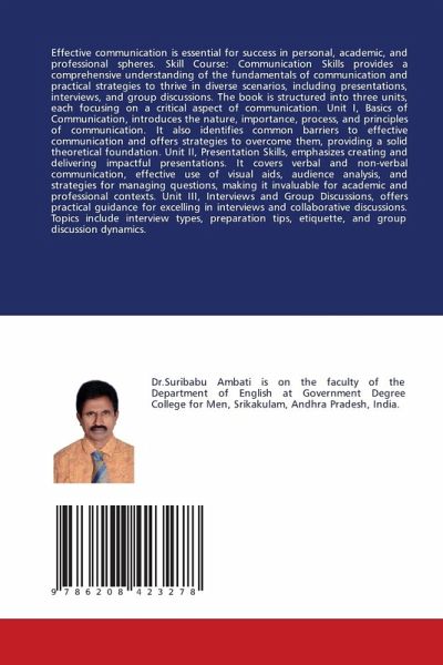 Effective communication is essential for success in personal, academic, and professional spheres. Skill Course: Communication Skills provides a comprehensive understanding of the fundamentals of communication and practical strategies to thrive in diverse scenarios, including presentations, interviews, and group discussions. The book is structured into three units, each focusing on a critical aspect of communication. Unit I, Basics of Communication, introduces the nature, importance, process, and principles of communication. It also identifies common barriers to effective communication and offers strategies to overcome them, providing a solid theoretical foundation. Unit II, Presentation Skills, emphasizes creating and delivering impactful presentations. It covers verbal and non-verbal communication, effective use of visual aids, audience analysis, and strategies for managing questions, making it invaluable for academic and professional contexts. Unit III, Interviews and Group Discussions, offers practical guidance for excelling in interviews and collaborative discussions. Topics include interview types, preparation tips, etiquette, and group discussion dynamics.