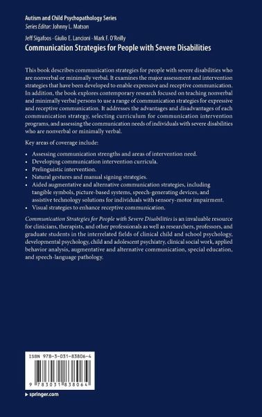 Communication Strategies for People with Severe Disabilities is an invaluable resource for clinicians, therapists, and other professionals as well as researchers, professors, and graduate students in the interrelated fields of clinical child and school psychology, developmental psychology, child and adolescent psychiatry, clinical social work, applied behavior analysis, augmentative and alternative communication, special education, and speech-language pathology.