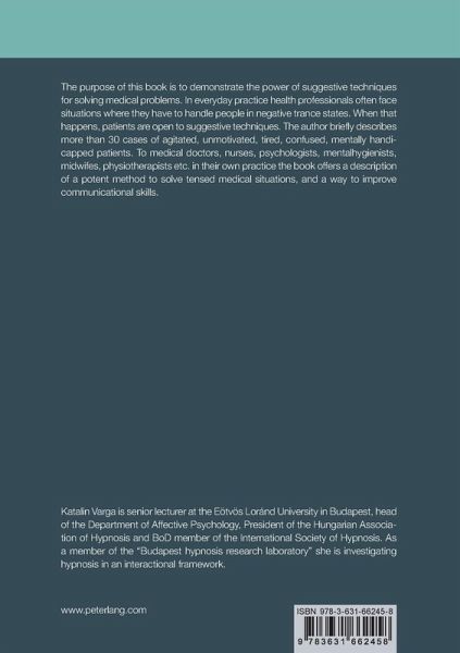 The purpose of this book is to demonstrate the power of suggestive techniques for solving medical problems. In everyday practice health professionals often face situations where they have to handle people in negative trance states. When that happens, patients are open to suggestive techniques. The author briefly describes more than 30 cases of agitated, unmotivated, tired, confused, mentally handicapped patients. To medical doctors, nurses, psychologists, mentalhygienists, midwifes, physiotherapists etc. in their own practice the book offers a description of a potent method to solve tensed medical situations, and a way to improve communicational skills.
