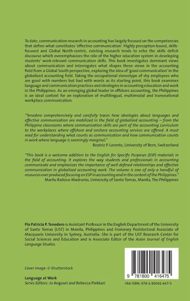 This book examines language and communication practices and ideologies in accounting education and work in the Philippines. As an emerging global leader in offshore accounting, the Philippines is an ideal context for an exploration of multilingual, multimodal and transnational workplace communication.