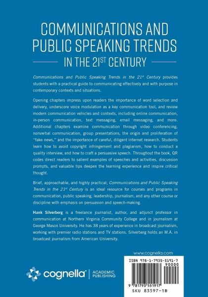 "Communications and Public Speaking Trends in the 21st Century provides students with a practical guide to communicating effectively and with purpose in contemporary contexts and situations. Opening chapters impress upon readers the importance of word selection and delivery, underscore voice modulation as a key communication tool, and review modern communication vehicles and contexts, including online communication, in-person communication, text messaging, email messaging, and more. Additional chapters examine communication through video conferencing, nonverbal communication, group presentations, the origin and proliferation of 'fake news,' and the importance of careful, diligent internet research. Students learn how to avoid copyright infringement and plagiarism, how to conduct a quality interview, and how to craft a persuasive speech. Throughout the book, QR codes direct readers to salient examples of speeches and activities, discussion prompts, and valuable tips deepen the learning experience and inspire critical thought"