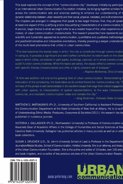 This book explores the concept of the "communicative city", developed initially by participants in an international Urban Communication Foundation initiative, by bringing together scholars from across the communication arts and sciences seeking to enhance our understanding of the dynamic relationship between urban residents and their social, physical, mediated, and built environments. The chapters are arranged in categories that speak to two larger themes: first, they all speak to at least one aspect of the qualifying and/or disqualifying characteristics of a communicative city. A second, larger theme is what we might refer to as a master trope of the urban experience and, indeed, of urban communication: inside/outside. The research presented here represents social scientific and humanistic approaches to communication, quantitative and qualitative methodologies, and positivist/normative and interpretive orientations, thereby providing a deeper understanding of the multi-level phenomena that unfold in urban communities.